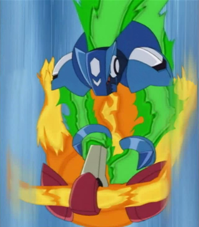 While Ox reels from the impact, he finds Gonta walking nearby, and decides that he needs something to gain an advantage in the fight. He invades Gonta's Transer and forcibly Denpa-Henkans him into Ox Fire. After knocking War-Rock on his backside, he goes straight for the kids, Subaru worried about what's happened to poor Gonta.