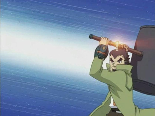 Goyouda:"Stupid Denpa Viruses, watch me squash you all with my G.H.O.D.!!!" (Giant Hammer Of Doom!!!)